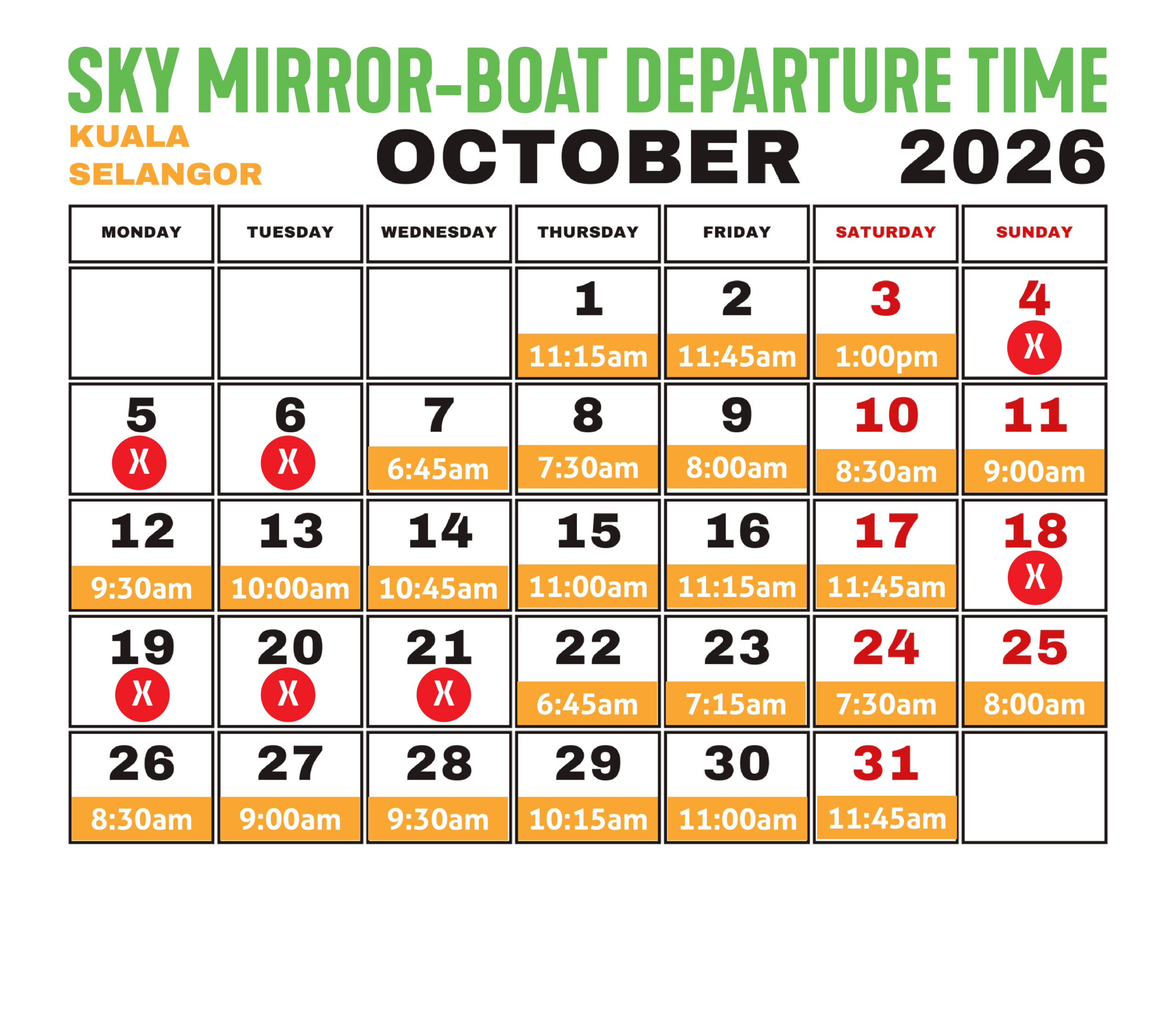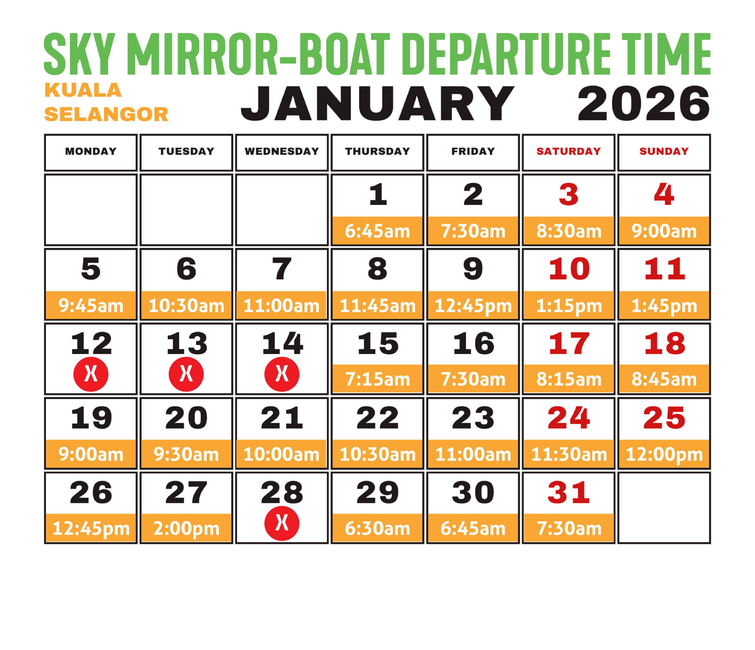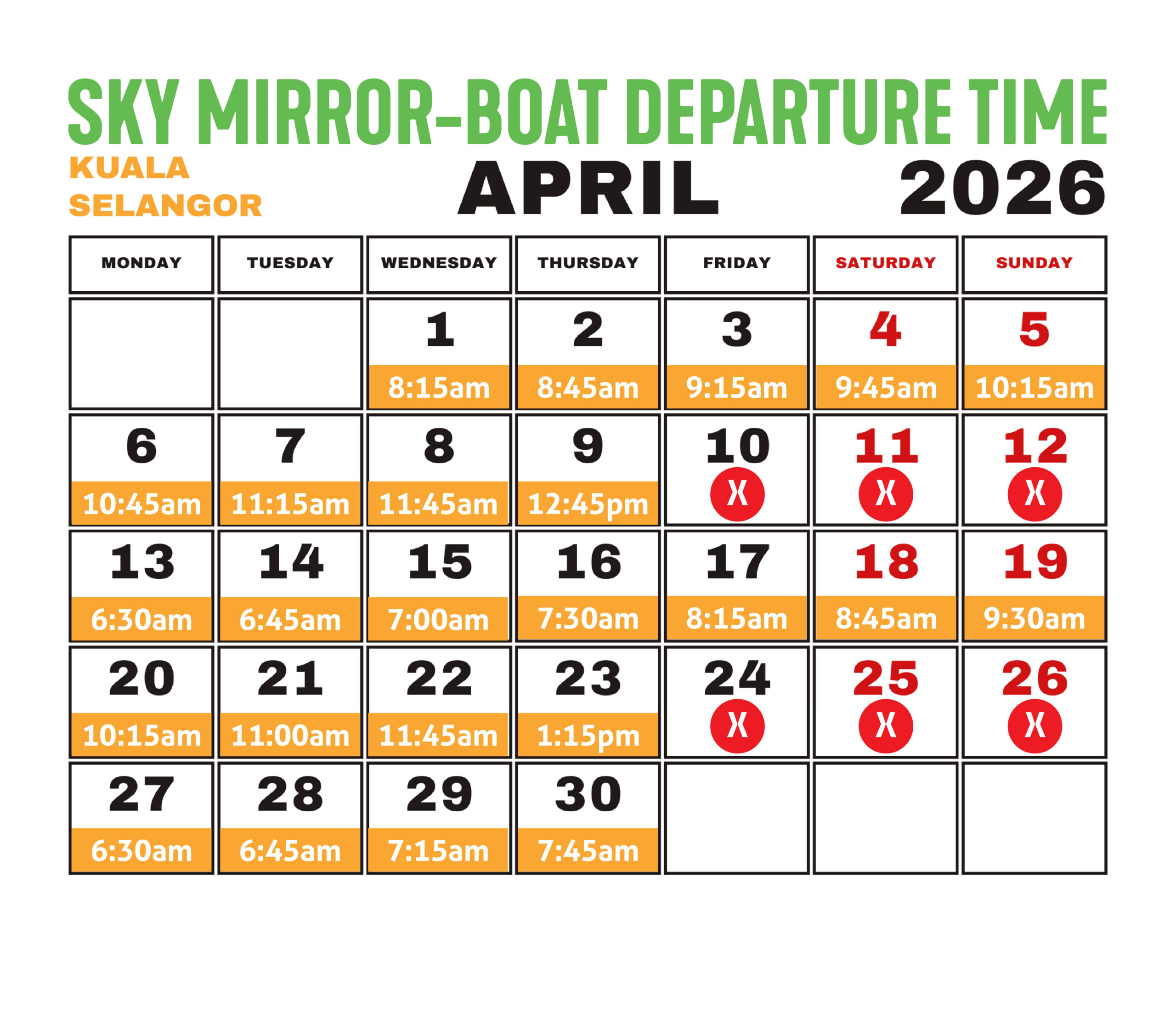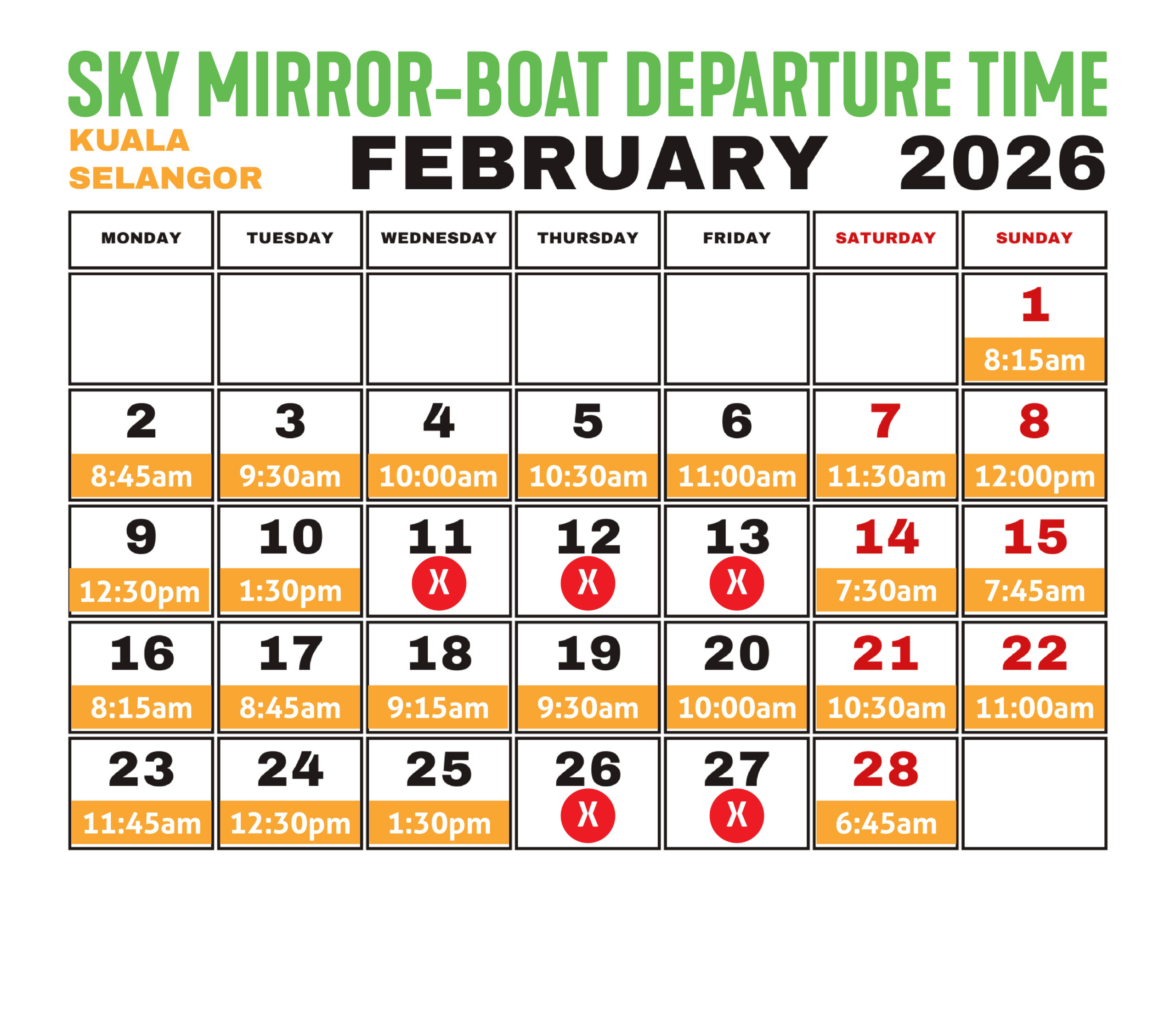 Below is our daily boat departure schedule for the Kuala Selangor Sky Mirror Tour this month. Please note that times are carefully calculated to coincide with optimal low tide conditions.