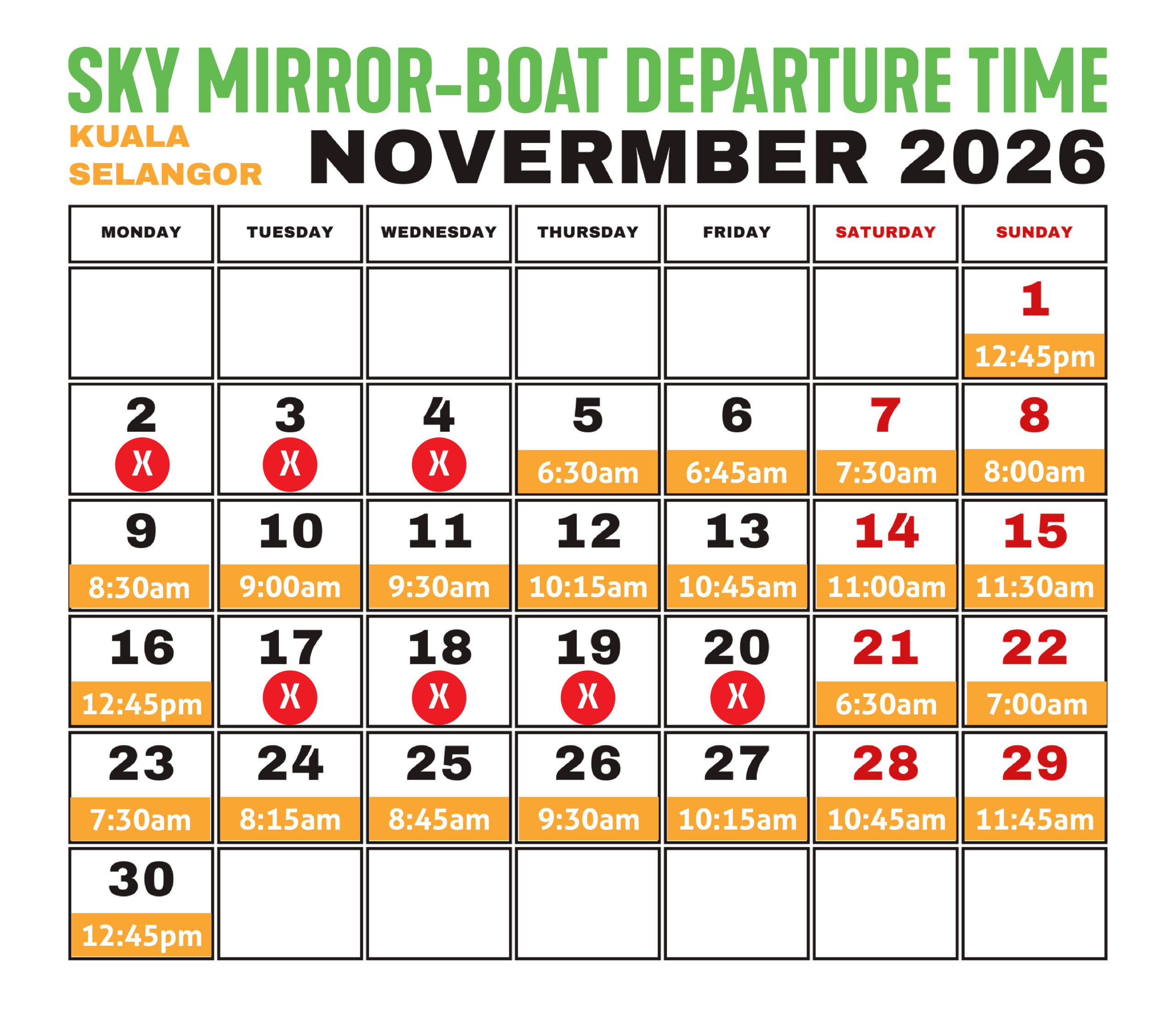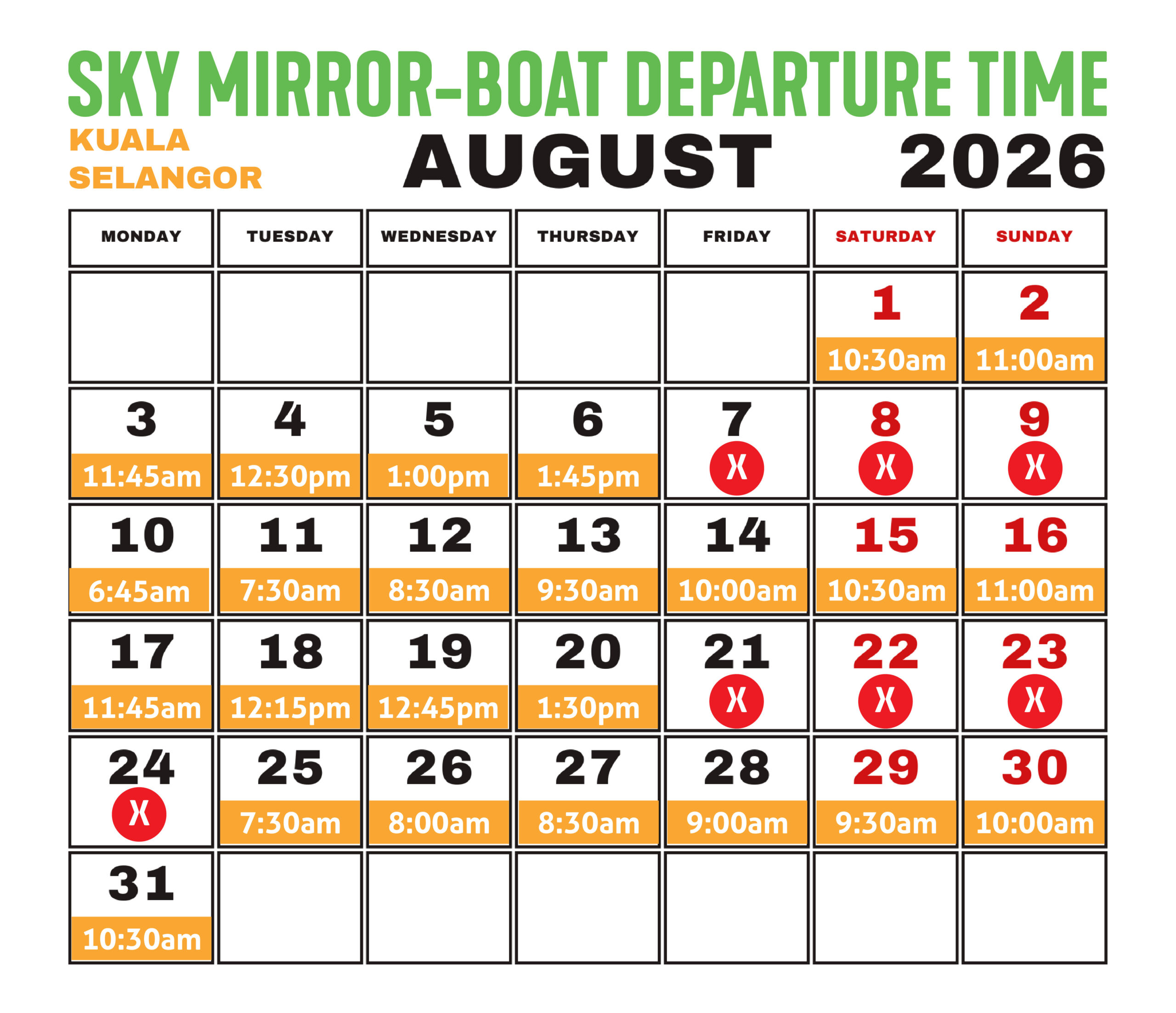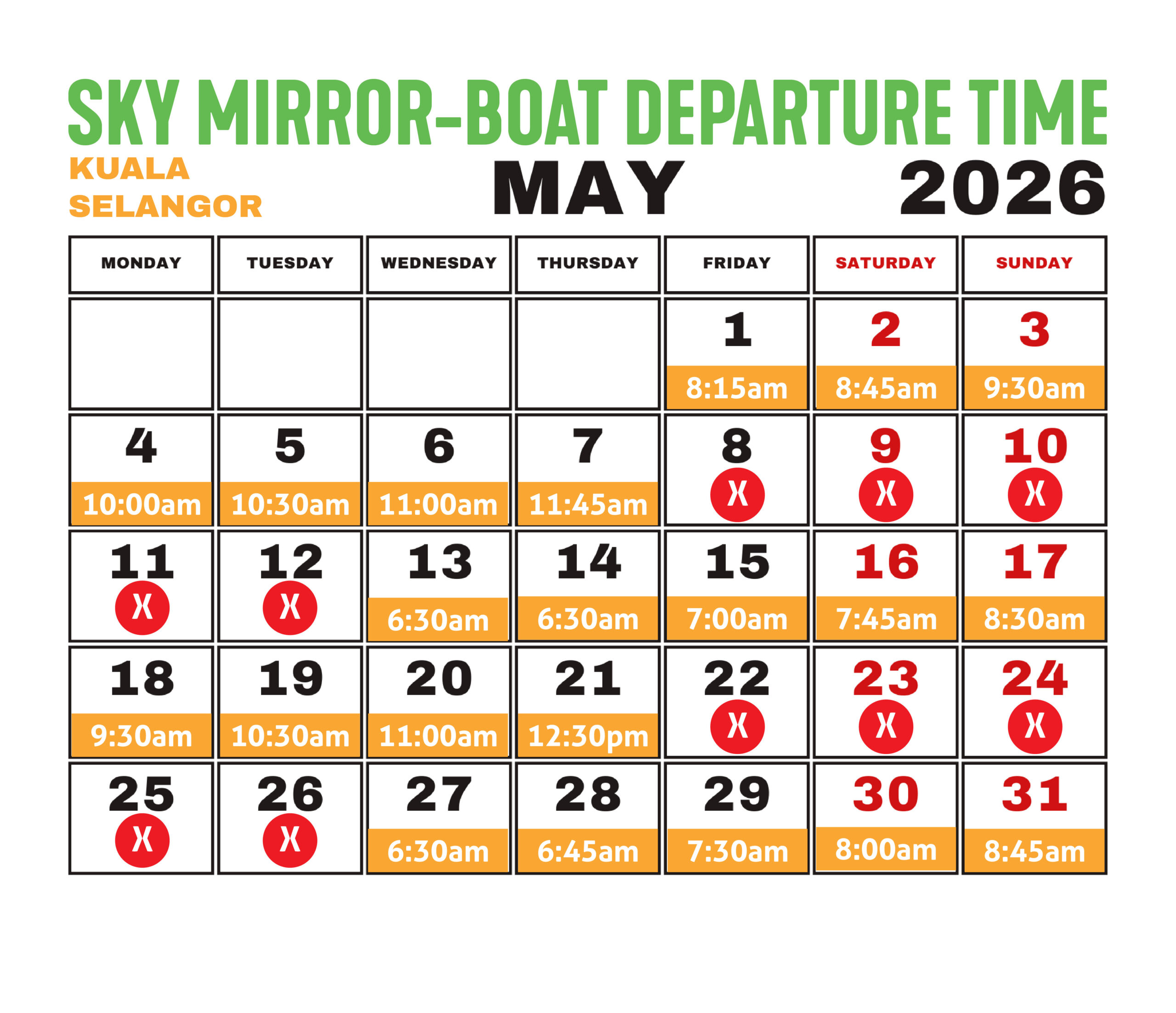 Below is our daily boat departure schedule for the Kuala Selangor Sky Mirror Tour this month. Please note that times are carefully calculated to coincide with optimal low tide conditions.