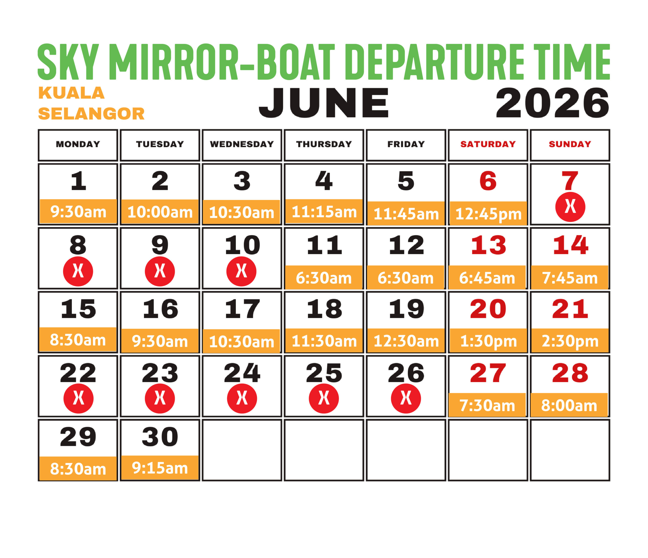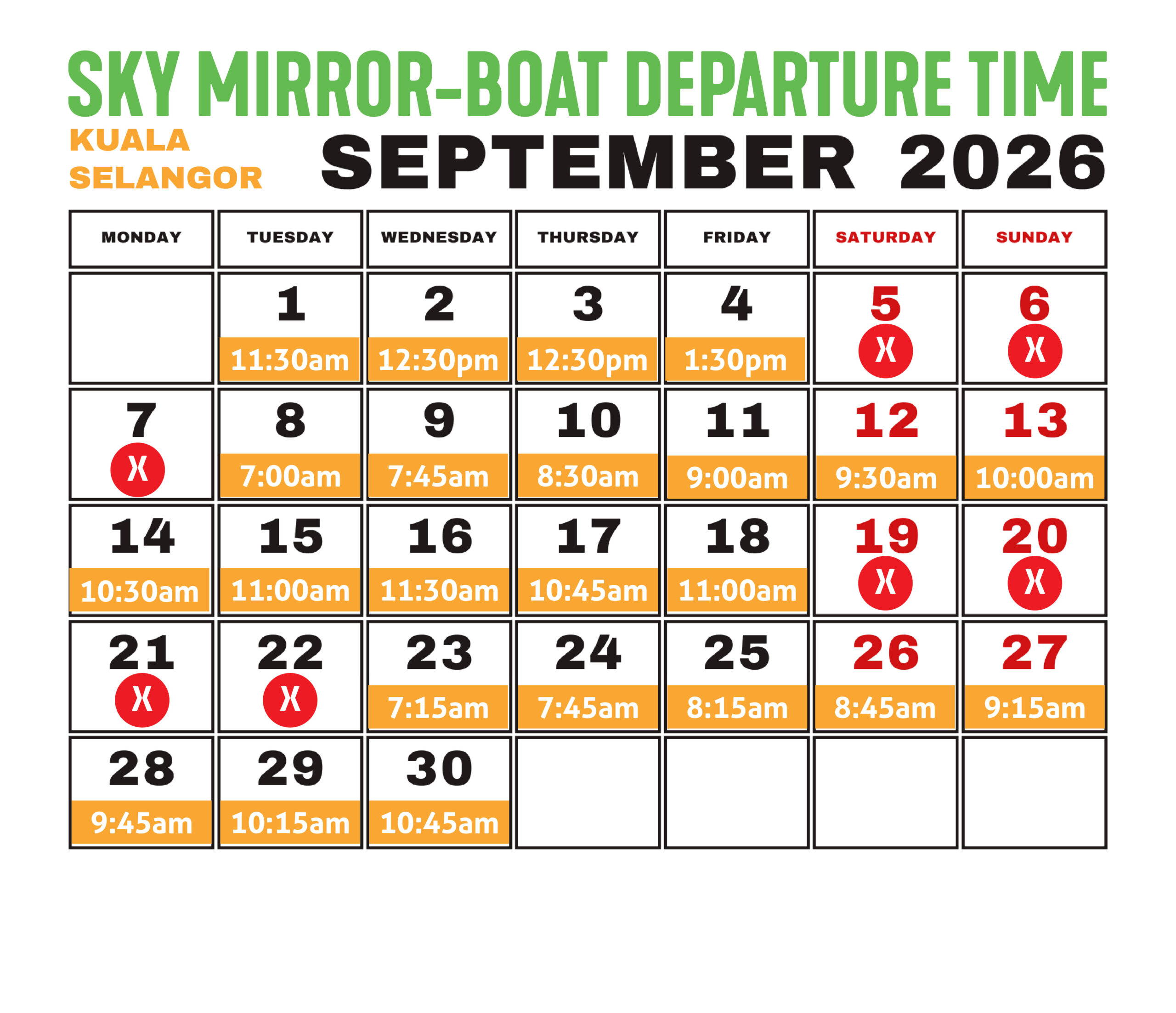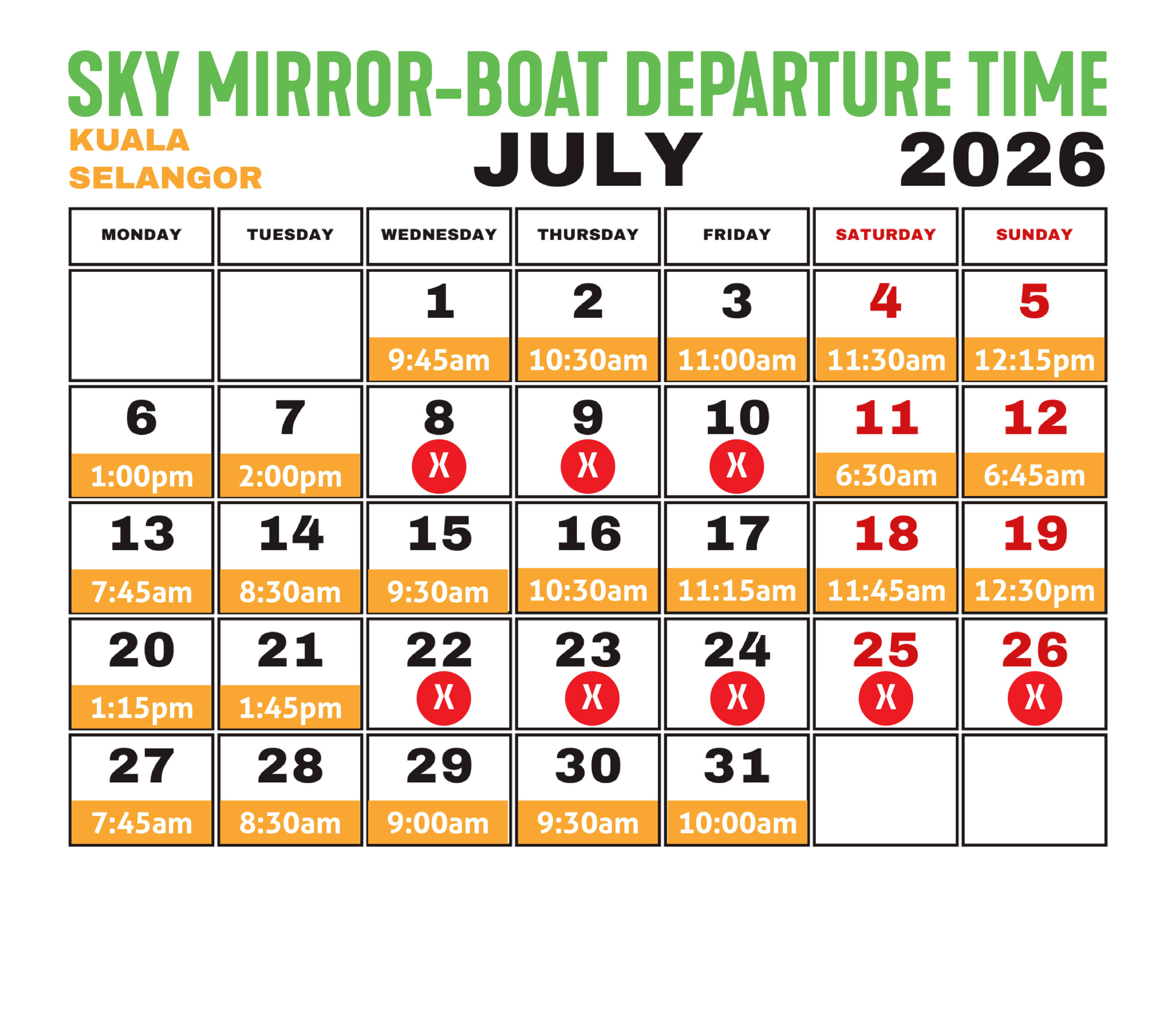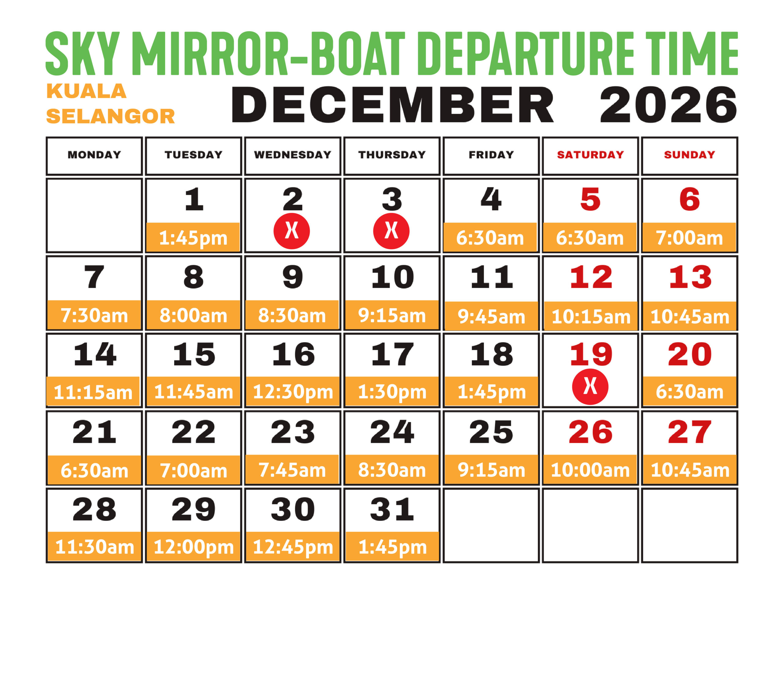 Below is our daily boat departure schedule for the Kuala Selangor Sky Mirror Tour this month. Please note that times are carefully calculated to coincide with optimal low tide conditions.